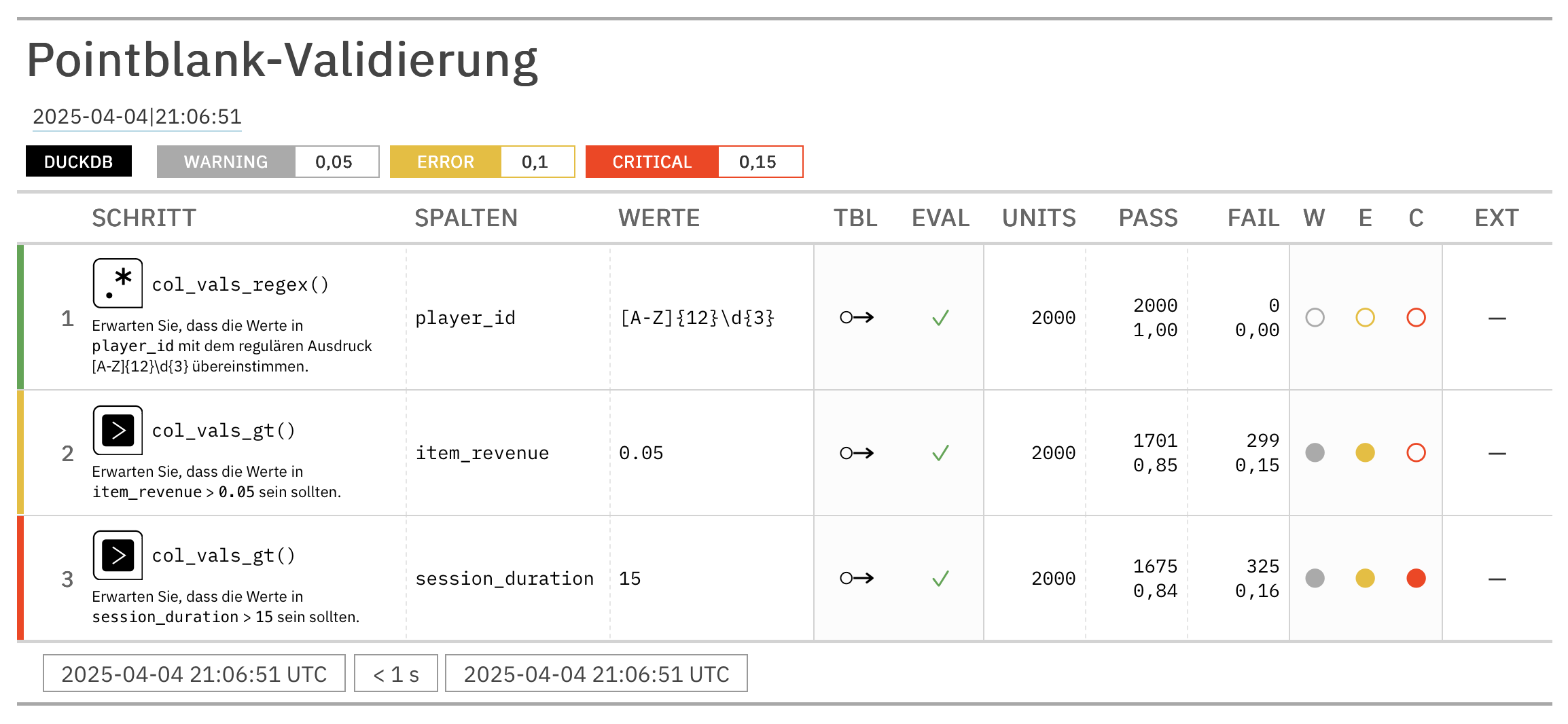 validation_2This data validation makes use of the many validation methods available in the library. Because thresholds have been set at the Validate(thresholds=) parameter, we can now see where certain validation steps have greater amounts of failures. Any validation steps with green indicators passed with flying colors, whereas: (1) gray indicates the ‘warning’ condition was met (at least one test unit failing), (2) yellow is for the ‘error’ condition (20 or more test units failing), and (3) red means ‘critical’ and that’s tripped when 10% of all test units are failing ones.