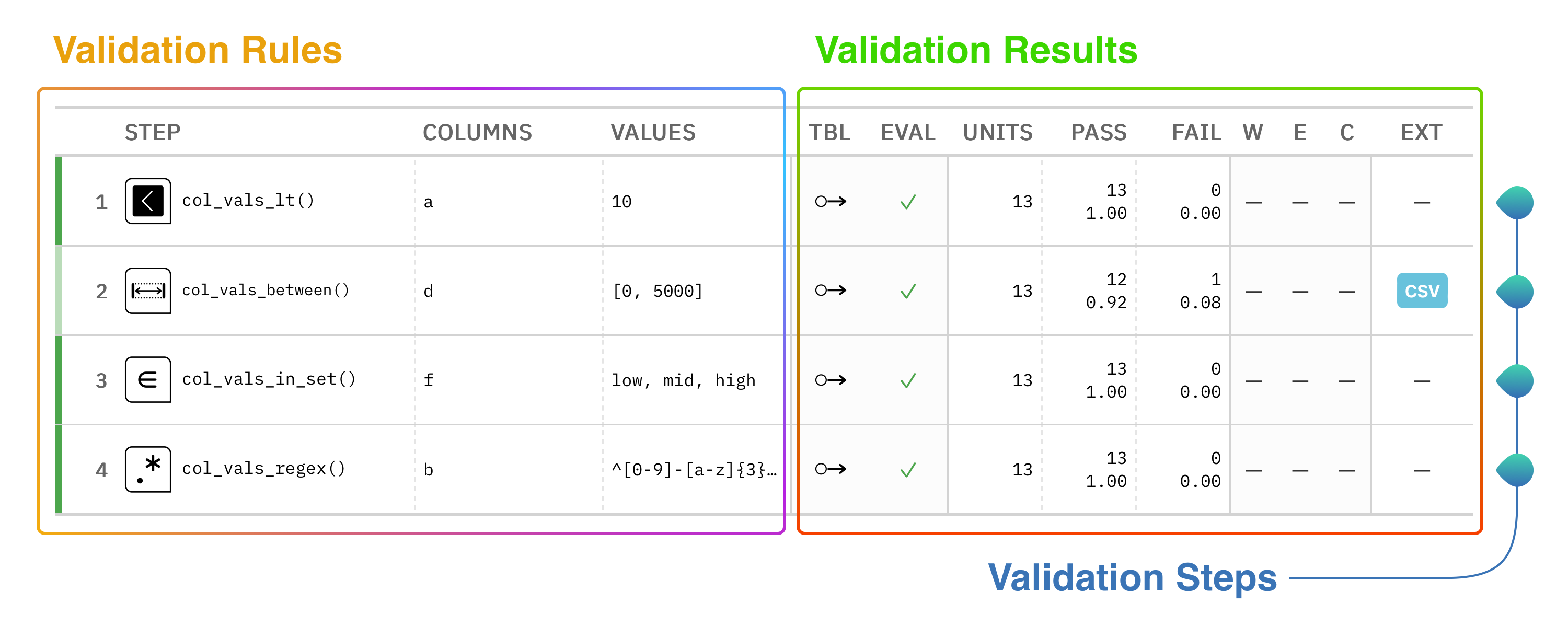 Each row in this reporting table constitutes a single validation step. Roughly, the left-hand side outlines the validation rules and the right-hand side provides the results of each validation step. While simple in principle, there’s a lot of useful information packed into this validation table.